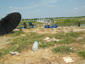 在松花江哈尔滨四方台大桥段,一些人利用活动板房、船只在江上营建了一个个简易渔村。十几家渔村每个休息日能接纳数千名游客。游客留下的大量垃圾遍布滩涂。还有的商贩将公厕建在船上,导致这一江段漂浮大量污物。