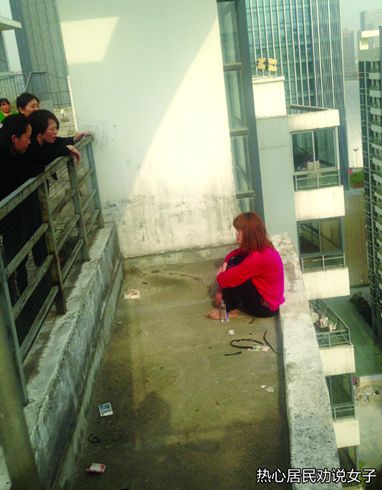 当日下午2时许,住在小区3号楼的张女士正在家中洗碗,突然发现对面4号楼,一名身穿红色上衣、黑色裤子的女子,坐在对面18层楼顶安全护栏外的平台上,双腿悬空,不停哭泣,似乎要跳楼。张女士赶紧让家人报警。