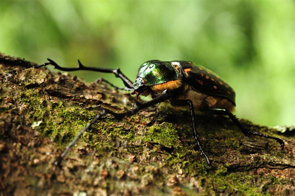 从照片看,这只被证实为阳彩臂金龟的甲虫为椭圆形,头面呈光亮的金绿色,前足、鞘翅大部为暗铜绿色,前足特别长。据了解,阳彩臂金龟为我国二级保护动物,分布于我国福建、江苏、浙江等地。