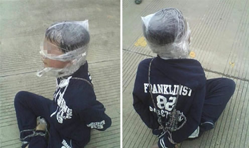9月24日,四川德阳13岁的初中生小易(化名)上学路上被绑架,随后被带到一个偏远山村的废弃房屋里。待绑匪走远后,小易摸索着慢慢跳出屋子,在公路上遇到路过的好心人唐克成成功获救。据了解,小易的自救知识是他从警匪片中学到的。目前,绑架小易的何某已被公安机关依法刑拘。图为被绑的小易。