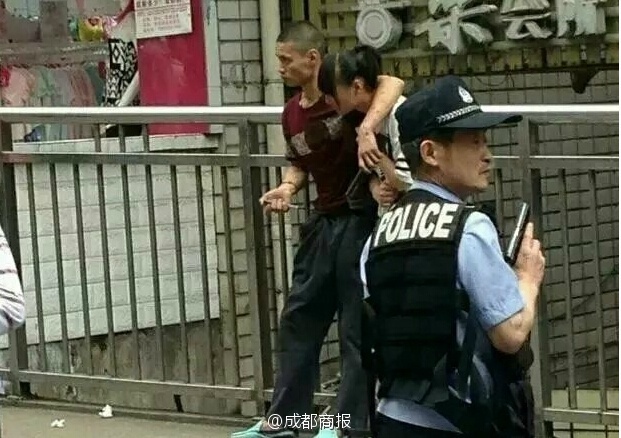 内江市公安局市中区分局城西派出所民警介绍,17日下午4时许,警方接到报警称,大洲广场附近一居民楼内有居民家中财物被盗,一名男子还手持匕首入室抢劫。接警后,民警赶到现场调查,正在查看监控录像时,该男子从楼内走出,民警便准备上前控制该男子,但居民楼一保安喊了一句“站住”,惊吓了该男子,他拔腿就跑,民警便追了上去。图为事发现场。