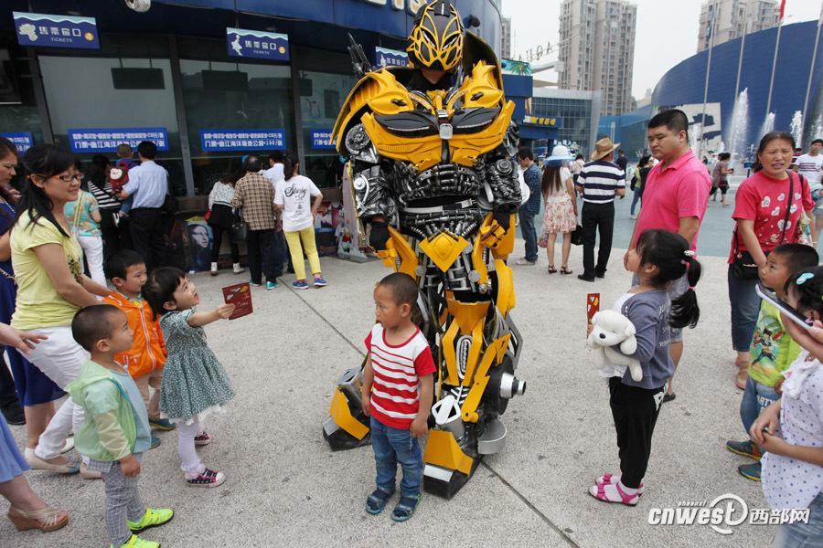 5月17日,西安曲江海洋极地公园广场上的变形金刚引来无数人围观拍照,小朋友们更是喜欢,他们转着圈看、用手摸摸,零距离接触真人版变形金刚。魏永贤摄图片来源:齐鲁网