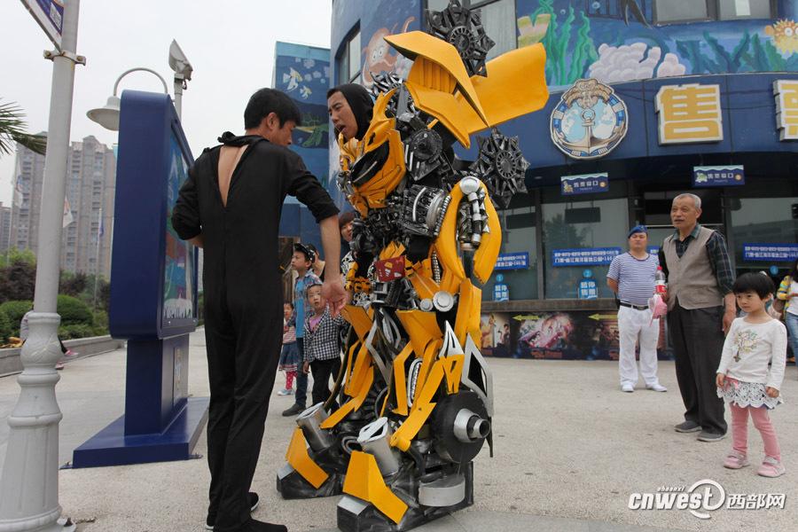 西安街头现真人版变形金刚 60斤盔甲累坏演员