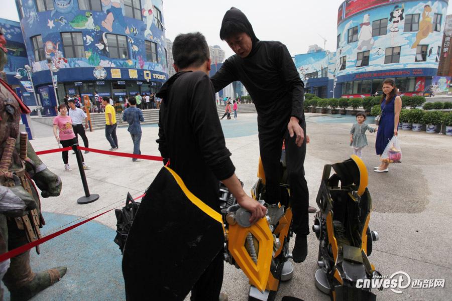 西安街头现真人版变形金刚 60斤盔甲累坏演员