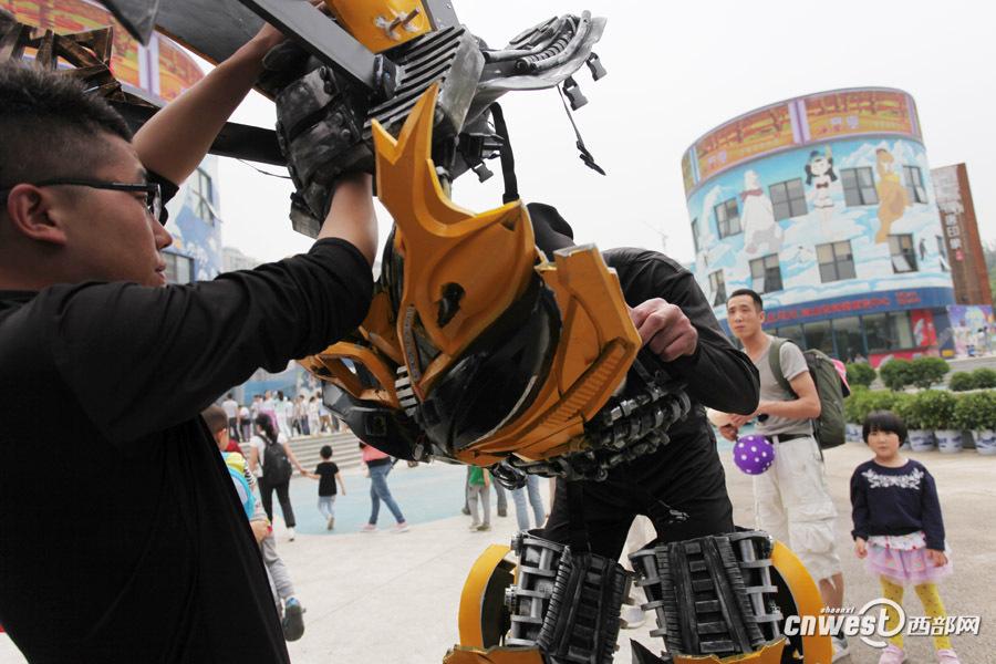 西安街头现真人版变形金刚 60斤盔甲累坏演员