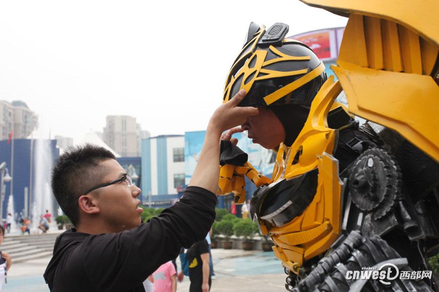 西安街头现真人版变形金刚60斤盔甲累坏演员