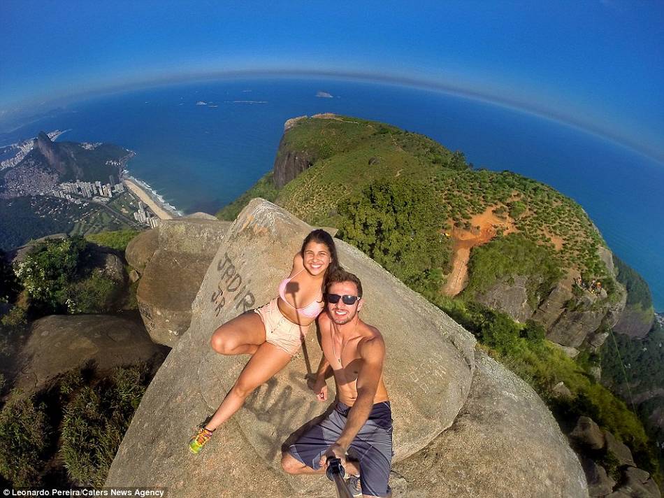 图为情侣悬崖照。终于这对情侣在相对安全的平稳岩石上自拍合影,身后是一望无际的大西洋。