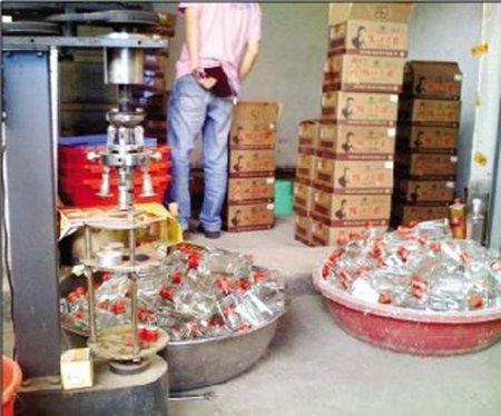 谷里派出所民警刘明告诉记者,经过进一步审讯,嫌疑人交代,他们的制假窝点在谷里和雨花台区交界的一个城郊接合部。派出所立即组织警力,对该制假窝点进行检查。民警在检查过程中发现,该制假窝点附近正在修路,因此过往车辆和行人较少,不容易引起外人注意。民警进入这里的平房中发现,该窝点的窗户被封闭,室内堆有大量空酒瓶和空酒箱及一些制作工具。据房东介绍,付某从去年11月份就租下了这间平房,当时他说要做仓库,没想到竟然是做这种非法的勾当。